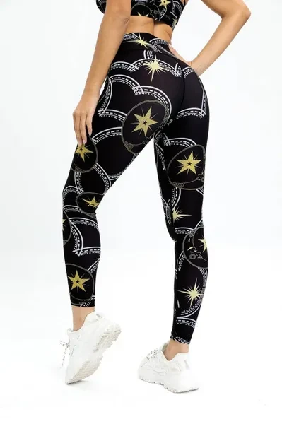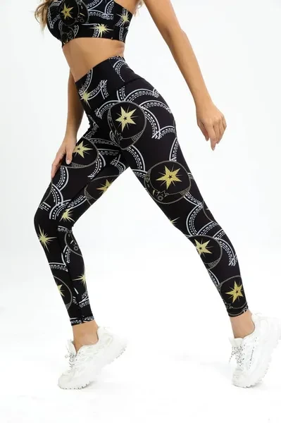 Pattern Description: 'Golden Star' is a celebration of female strength, resilience, and brilliance, shining a light on the limitless potential and extraordinary beauty of women. Against a background of deep black, sparkling golden stars and a glowing moon shine bright. These celestial elements are joined together by wispy, abstracted grey clouds, symbolizing the many challenges that women have overcome on their journey towards empowerment and equality. Product Features: High-waisted design perfectly shapes, supports and flatters any body types No small elastic band at the top No side seams for extra flattering fit and comfort Pair it with our matching Golden Star Weave Back Bra for a totally unique and dreamy look Fabric: Made with 84% RPET and 16% spandex from recycled plastic bottles and it is 100% recyclable! - Four-way stretch, breathable and anti-bacterial. Model Info:  Lulu// Height: 5'7  // Bust 35” //  Waist 25.9” // Hips 38.9 // SILVERWIND size M in tops & bottoms  Gabe// Height: 5'7  // Bust 35” //  Waist 23.6” // Hips 38.1 // SILVERWIND size S in tops & bottoms