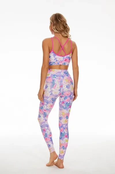 Pattern Description: Set against a backdrop of purple and pink hues, our designer used the abstract artistry of watercolor to portray an array of beautiful flowers. It's a vivid symbol of feminine confidence, beauty, and charm, offering a perfect blend of romance and vivacity. As you move through your yoga sequences or workout routines, this design not only enhances the aesthetic appeal of your attire but also energizes your fitness journey with its lively and romantic atmosphere. Product Features: High-waisted design perfectly shapes, supports, and flatters any body types No small elastic band at the top A hidden pocket at the back No side seams for extra flattering fit and comfort